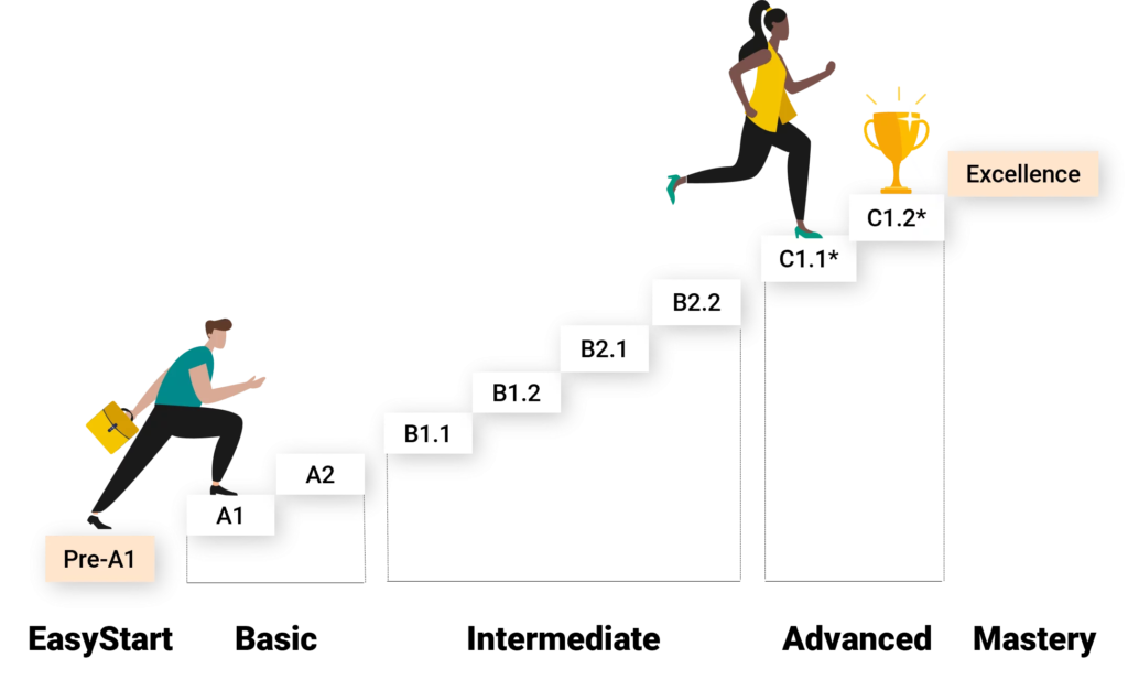 Alle Lernenden folgen einem strukturierten Lernweg von GER-Stufe Pre-A1 bis C1.