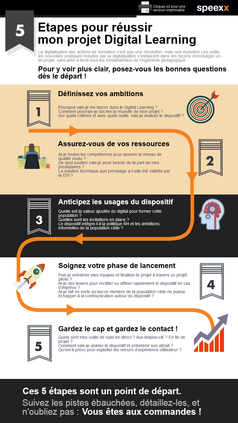 Dans cette infographie tirée directement de l’expérience de Speexx et de ses clients, nous vous proposons 5 étapes de réflexion qui vous permettront de mettre n’importe quel projet Digital Learning sur les bons rails ! Les meilleurs outils du monde ne sont rien sans un pilote déterminé, et c’est à vous, Responsable formation ou RH, que revient ce rôle.